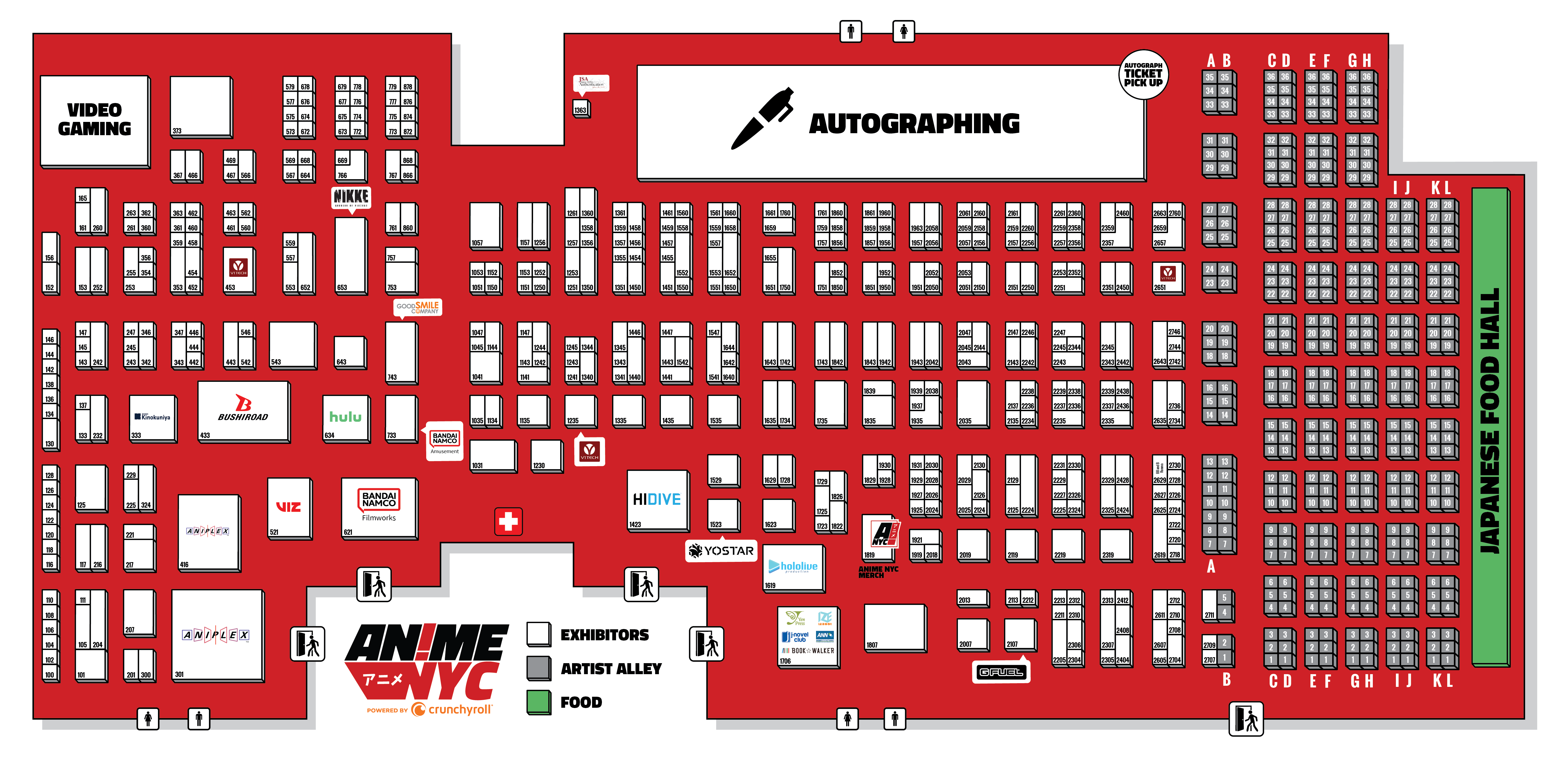 Jak już jesteśmy przy wystawcach, to poniżej mamy mapę hali wystawców, czyli głównej części Anime NYC, zaś rozpiskę artystów możemy znaleźć tu, a wystawców tutaj. Te listy pewnie wygasną i zdezaktualizują się w przeciągu roku, ale nie mam jeszcze dobrego pomysłu jak je zarchiwizować. Jak coś się pojawi to edytuję tę część.