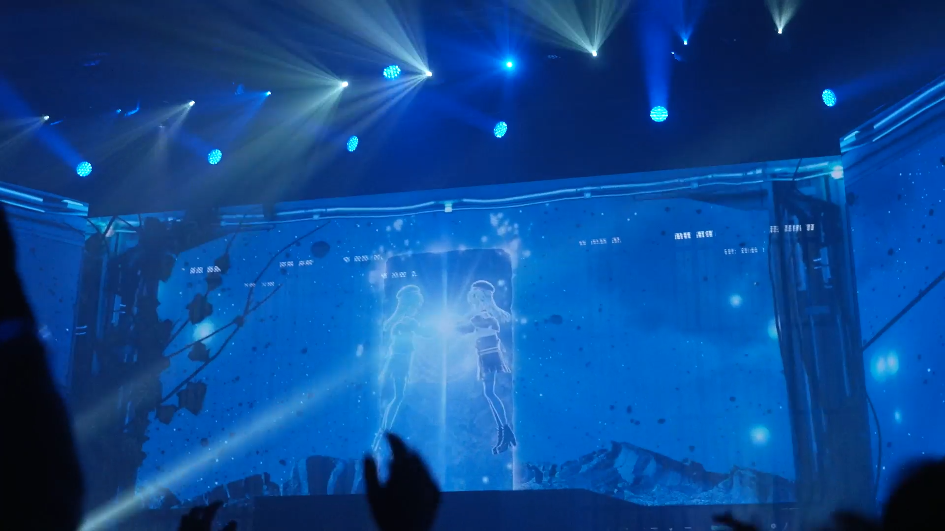 Następnie Ryuseigun, ta piosenka a po nim chyba fragment, który najbardziej zapadł mi w pamięci; po Ryuseigunie data na ekranach zaczęła rosnąć od 20.02.2024 w górę. Gdy mniej więcej byliśmy w okolicach 2050 powiedziałem do wspomnianego wcześniej stojącego obok mnie nowego kolegi z Japonii, "Hyakunen, soriroki da", on nieco zaskoczony, zgodził się. Gdy data zatrzymała się na 20.02.2124 i usłyszałem "Hyakunen hetsu tara kawaru to omotsu te ita", no to zwyczajnie, jak to się mówi, dach zaczął przeciekać i zaczął padać deszcz. Soriroki to mój ulubiony utwór Midnight Grand Orchestry i zawsze bardzo emocjonalnie mnie ruszał. Śpiewałem z Suisei, głos mi się totalnie załamał, a to, że koncert jest technicznie na niesamowitym poziomie nie dało o sobie zapomnieć. Bo na ekranach dalej się działo - pojawiła się postać wspominana w utworze, na którą podmiot liryczny tyle czeka.