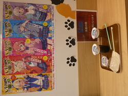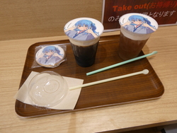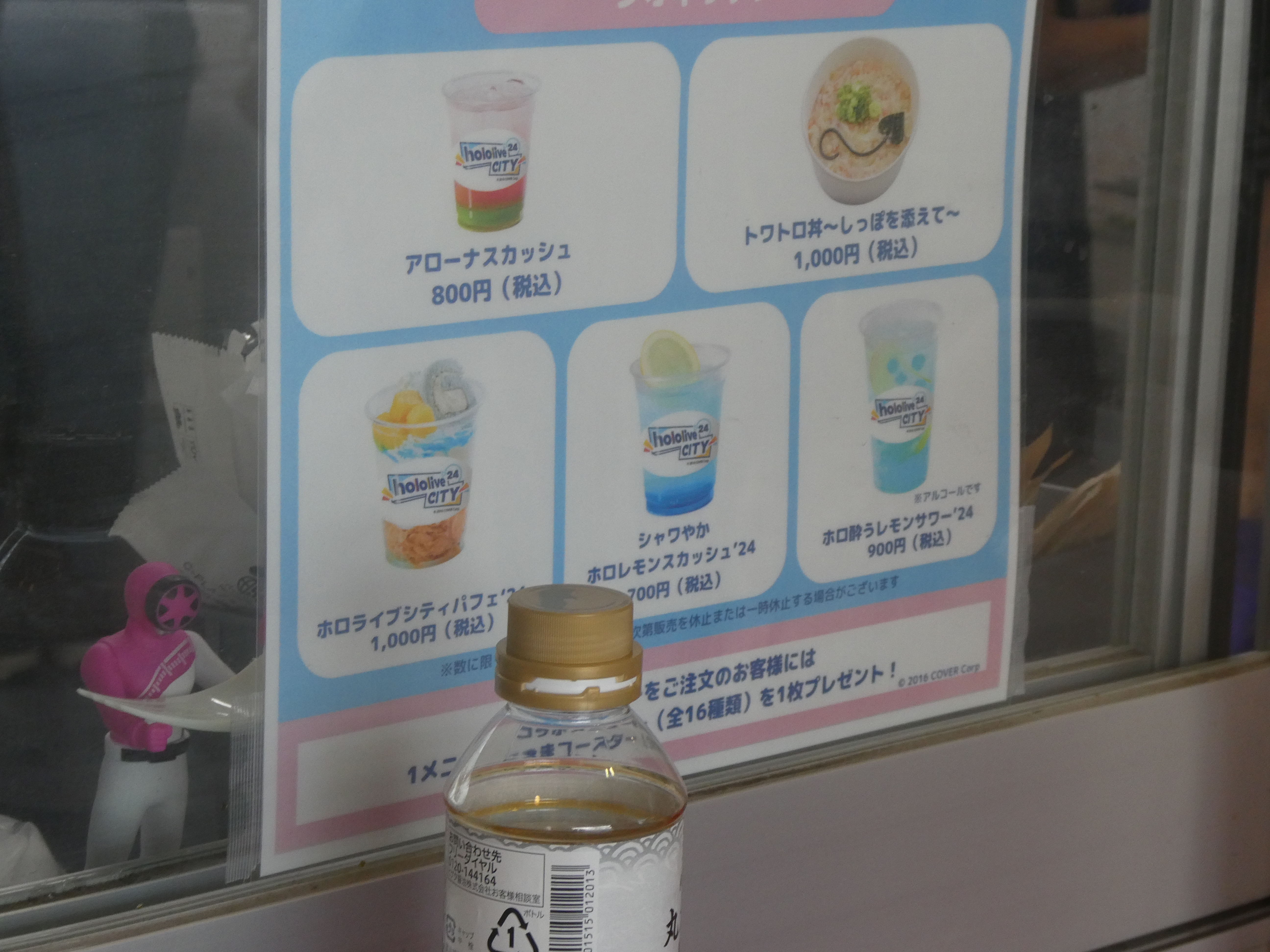 Na terenie obiekty była kafelka z tematycznym jedzeniem. Zamówiłem Suisei napój i Suisei churros. Jedzenie smakowało dokładnie tak jak sobie wyobrażałem, churros był słodki i barwił na niebiesko, a smak Suisei napojów najwidodoczniej jest lekko kwaśny. Do każdego zamówione produktu dostawało się losowego coastera. Właściwie od razu dostałem Suisei, więc nie musiałem już zamawiać kolejnych churrosów.