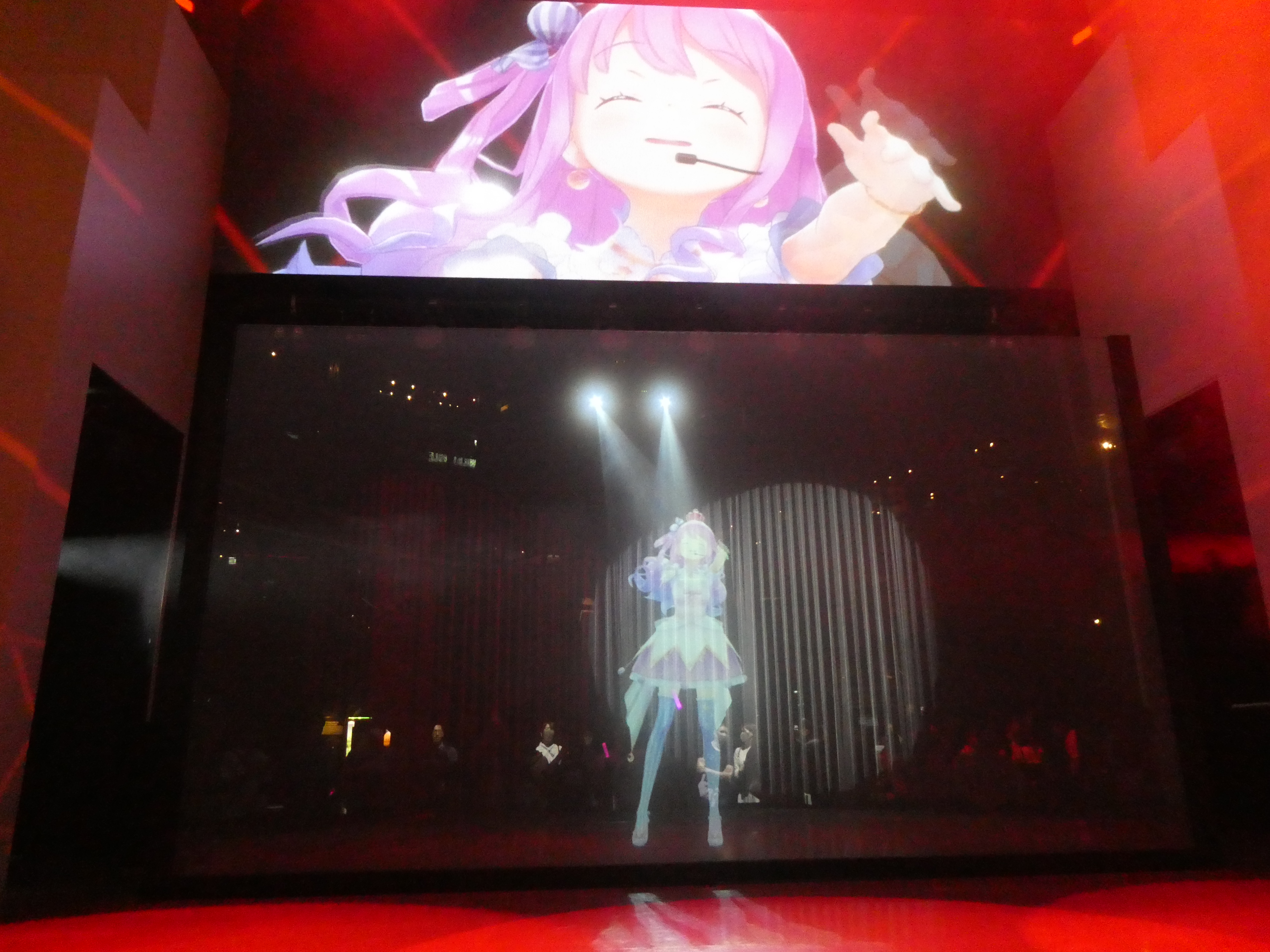 Ekran był faktycznym szkłem do wyświetlania hologramów, na samej scenie również widać ciekawe efekty świetlne. Nie wolno było nagrywać, więc nic takiego nie mam, ale trochę przypominały mi to białe miasto z kostek w Nier:Automata, oczywiście nic tam nie wystawało i nie chowało się, po prostu efekty świetlne obok ekranów tak się zachowywały, że skojarzyły mi się z tym. Ponadto z boku widoczne były dwa dodatkowe ekrany, gdzieś na poniższych zdjęciach widać ich fragment. W tle widać było też staff-sana, który co jakiś czas zachęcał do klaskania czy machania penlightem. Przed samym minilive'em czekała nas ponad dziesięcio minutowa reklama tego co w Joypolis można robić w trakcie trwania collabu.