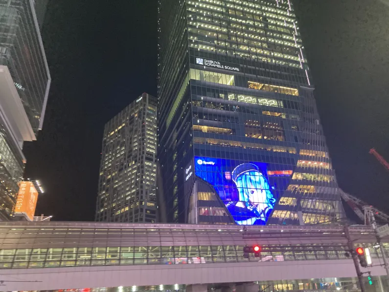Reklama na Shibuya Scramble Sky Shibuya Około 02.02.2025 Duża reklama na budynku Shibuya Scramble Sky