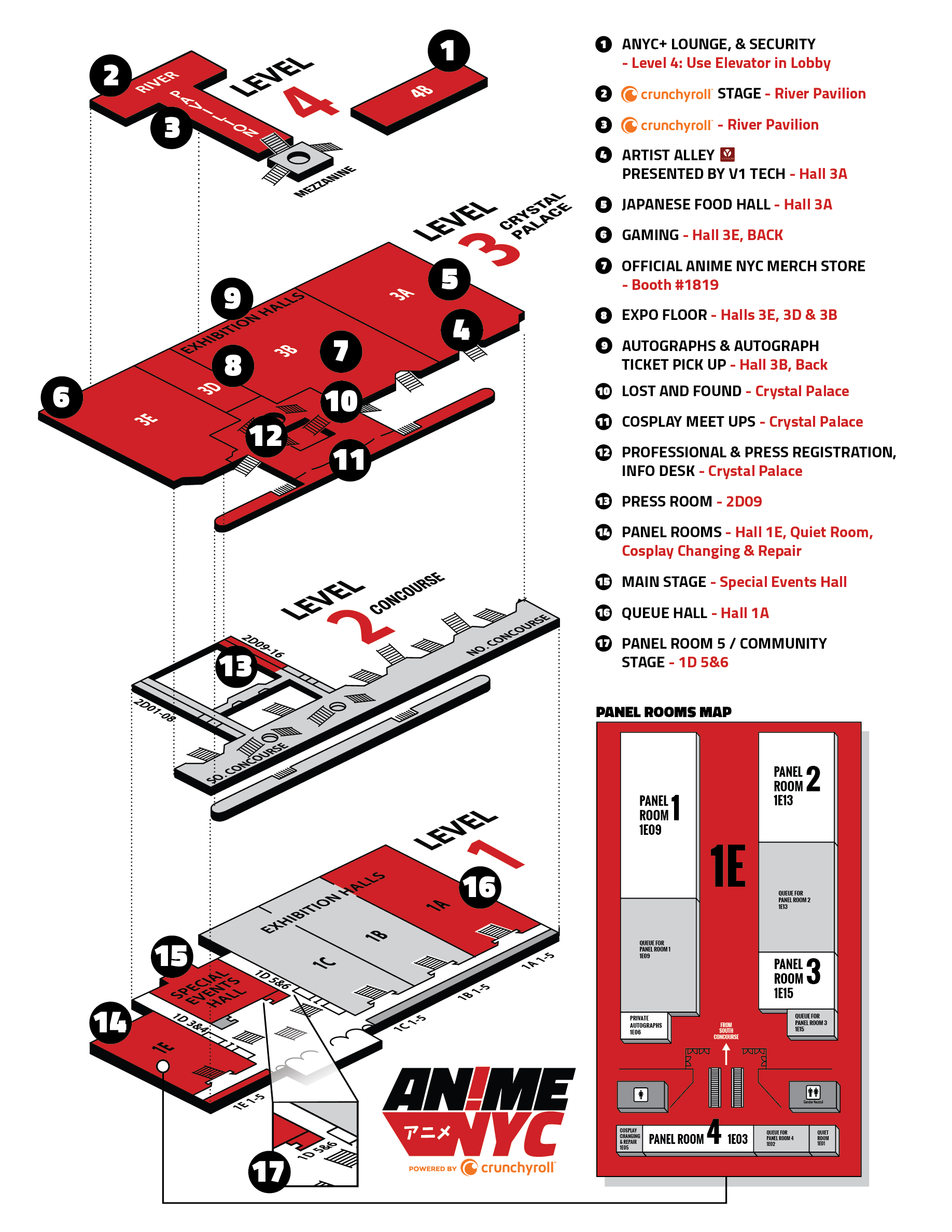 Cały wynajęty obiekt prezentował się na mapie w sposób przedstawiony poniżej. Hala wystawców (ten obiekt na mapce powyżej, na tej poniżej jest częścią poziomu trzeciego) to 25 000m^2 powierzchni. Całej wynajętej powierzchni nie znalazłem, ale powinna być około dwa razy większa. Całe centrum Javtisa oferuje wynajem do 310 000m^2. Dla porównania Pyrkon to 75 000m^2. Więc w wypadku Anime NYC mówimy o hali wystawców rozmiaru 1/3 całego Pyrkonu.