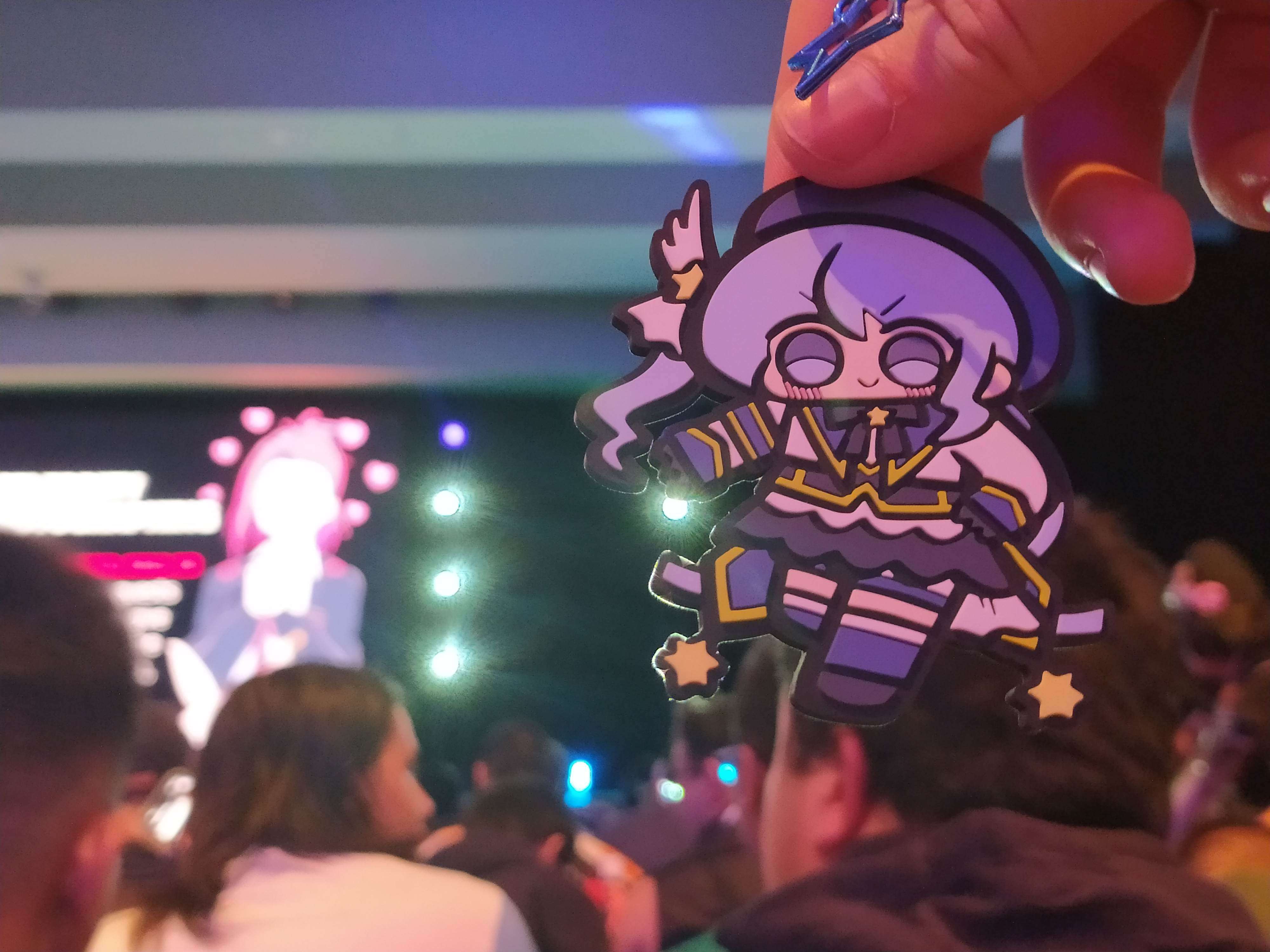 Na prawo od wejścia zaś znajdowała się obszerna strefę artystów, do niektórych z nich - wiem o Kamui i oimo ustawiały się półgodzinne kolejki. Tutaj podobnie jak w przypadku Omocat interweniowała ochrona i ucinała je mówiąc by przyjść później. Zaskoczeniem pewnie nie będzie żadnym, jak powiem, że dominującą serią u artystów był Genshin Impact. Zaskoczeniem za to może być jak powiem, że tylko odrobinę mniej popularne były vtuberki. A za sprawą piątkowego koncertu niesamowicie popularna była Hoshimachi Suisei. Więc sporą część piątku poświęciłem na przeglądanie kto co ciekawe ma do zaoferowania. Najpopularniejszymi wystawianymi towarami były printy i keychainy, trochę rzadsze były acyrylic standy i artbooki, czasem pojawiały poduszki i koszulki. Cena za keychaina to przeważnie $15, cena za printa to $20. Drogo jak to tak przeliczać w głowie na złotówki, dlatego ja przestałem przeliczać bardzo szybko. A, no i ponieważ w piątek przecież był koncert Suisei, to czasem zdarzało się że keychain z Suisei kosztował $20, a print z nią $25. Dzięki wspaniałemu wolnemu rynkowi mogę teraz mówić, że tak, płaciłem Suitax.