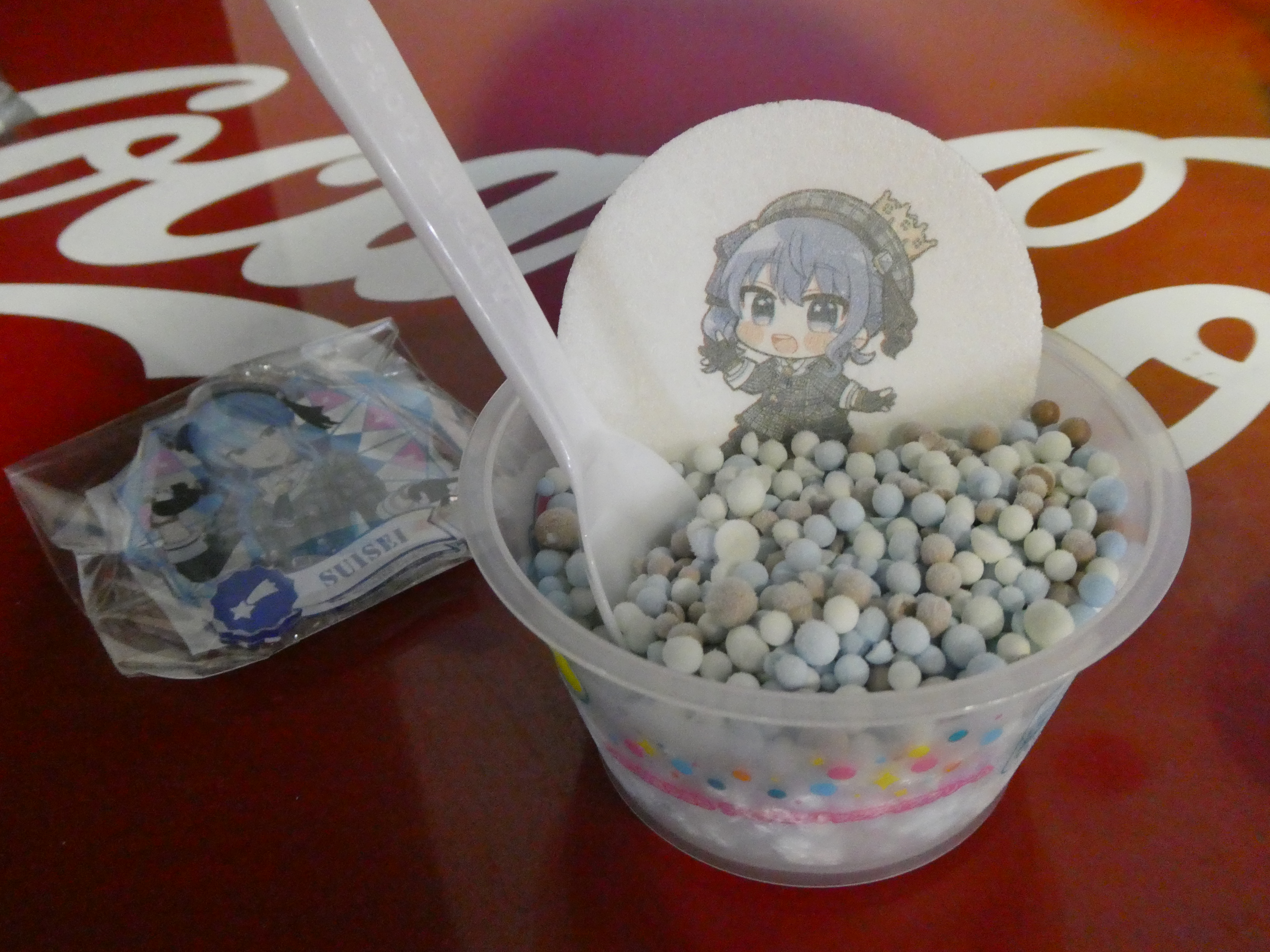 Collabowe jedzenie, można było więc zjeść np. Hoshiyomi Cake Crepe, wypić Suisei napój, zjeść donuty Fuwamoco i tak dalej. Jedzenie tu, w Joypolis, w Gratte pokarmów o smaku Suisei nauczyło mnie, że te niebieskie fragmenty zawsze są lekko kwaśne. Najwidoczniej tak smakuje kometa.
