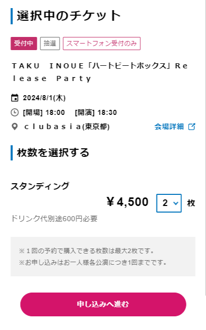 W tym miejscu zamieszczę też przykład zakupu biletu na platformie L-tike. Dla przykładem będzie Taku Inoue Release Party - Heartbeat. Zalecam oczywiście zapoznanie się z DeepL. Jak widać screeny robione są z telefonu. Jeżeli loteria ma mieć bilety przekazywane na L-tike na telefonie to zapisać się na loteirę będzie można tylko z urządzenia mobilnego typu smartfon. Nawet mój iPad nie działa.