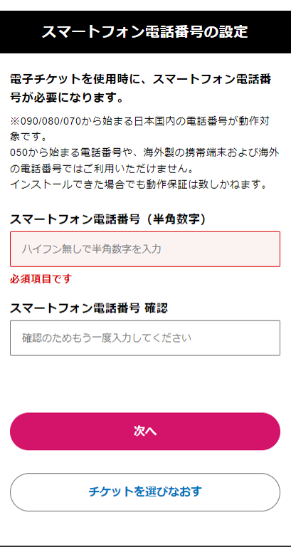 Tutaj podajemy nasz japoński numer telefonu, zaczynający się 0 zamiast 81. Na tym numerze musimy mieć już skonfigurowaną aplikację L-Tike, jeżeli chcemy by bilet się kiedyś u nas pojawił. O tym mówi też ostrzeżenie po prawej, które przeklikujemy.