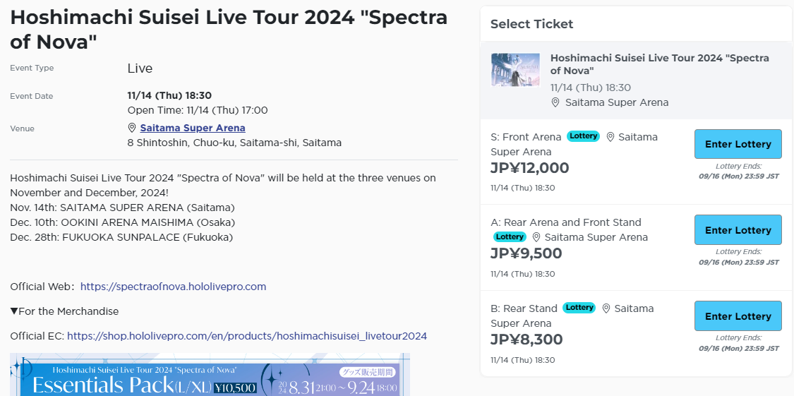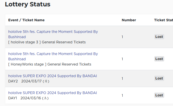 Następnym wydarzeniem, na które chciałem się zapisać - trochę przewidując już porażkę na Midnight Mission - było marcowe Hololive Super Expo 2024. Tutaj loteria odbywała się w dwóch miejscach, po pierwsze ponownie na L-tike oraz na gaijin-friendly Zaiko. Zapisałem się ma trzecią turę loterii na dwa dni konwentu oraz Stage 3 i Honeywork Stage - na tych dwóch Stage'ach występowała Suisei. W dniu losowania zobaczyłem ten widok: